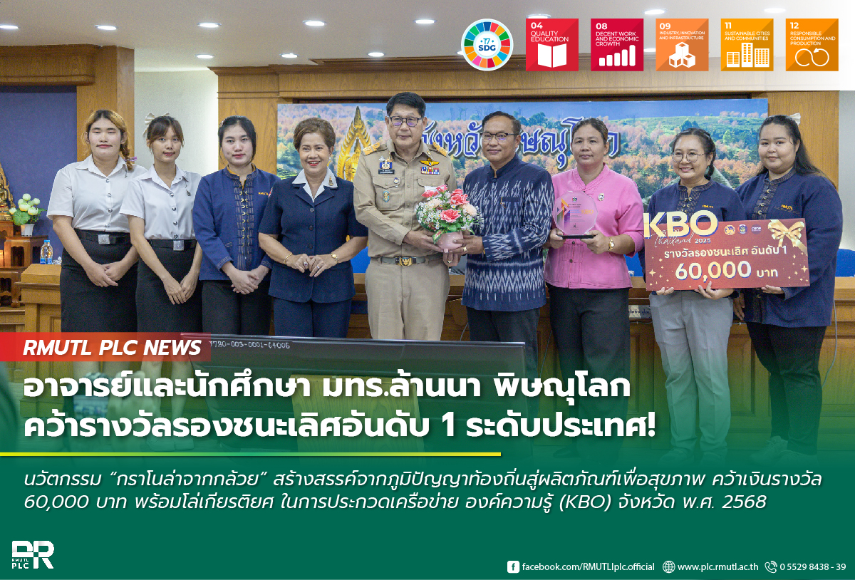 โดย มทร.ล้านนา พิษณุโลก ได้รับรางวัลรองชนะเลิศอันดับที่ 1 พร้อมเงินรางวัล 60,000 บาทและโล่รางวัล จากผลงานนวัตกรรม “กราโนล่าจากกล้วย” ซึ่งเป็นผลิตภัณฑ์เพื่อสุขภาพที่พัฒนาต่อยอดจากผลผลิตกล้วยของเกษตรกรในท้องถิ่น ผลงานของนักศึกษาคณะวิทยาศาสตร์และเทคโนโลยีการเกษตร และผู้ช่วยศาสตราจารย์สุริยาพร นพรรัมย์ หัวหน้าหลักสูตรวิทยาศาสตร์และเทคโนโลยีการอาหาร