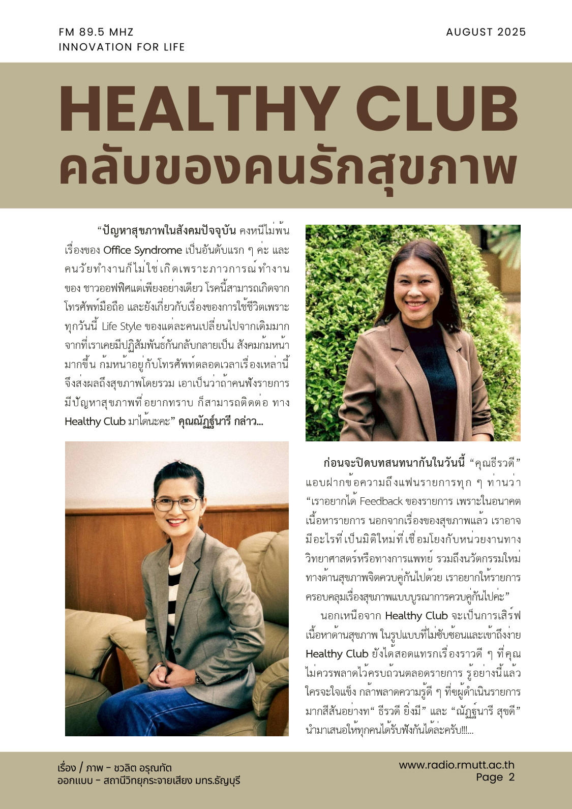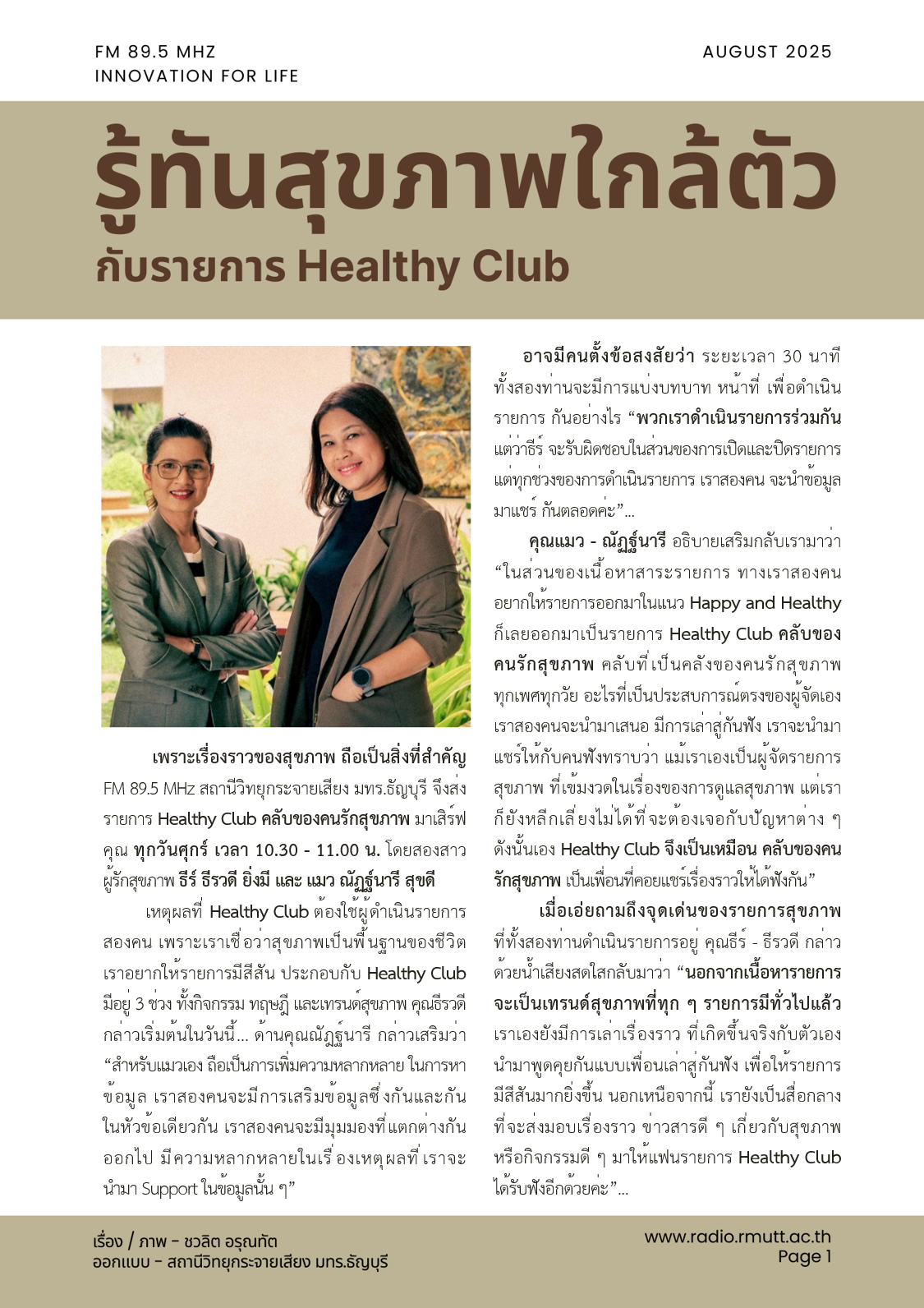 เพราะเรื่องราวของสุขภาพ ถือเป็นสิ่งที่สำคัญ FM 89.5 MHz สถานีวิทยุกระจายเสียง มทร.ธัญบุรี จึงส่งรายการ Healthy Club คลับของคนรักสุขภาพ มาเสิร์ฟคุณผู้ฟัง ทุกวันศุกร์ เวลา 10.30 – 11.00 น. โดยสองสาวผู้รักสุขภาพ ธีร์ ธีรวดี ยิ่งมี และ แมว ณัฏฐ์นารี สุขดี