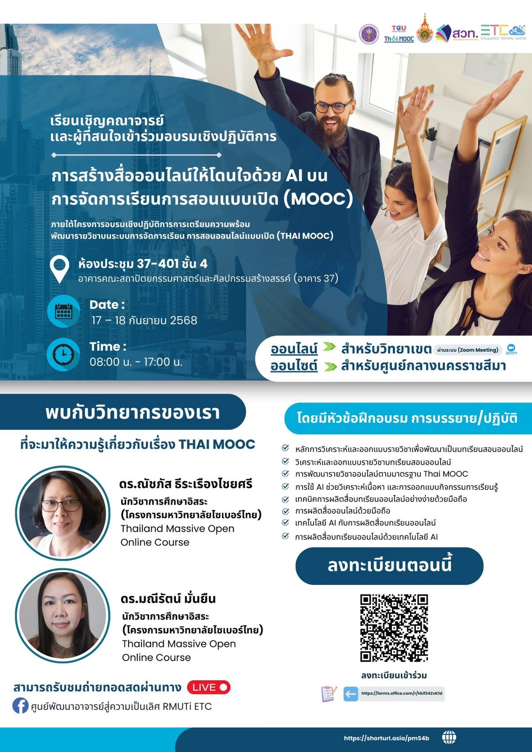 วันที่ 17 กันยายน 2568 มทร.อีสาน โดย รองศาสตราจารย์ ดร.โฆษิต ศรีภูธร รักษาราชการแทนอธิการบดี มทร.อีสาน เป็นประธานเปิดการอบรมเชิงปฏิบัติการ “การสร้างสื่อออนไลน์ให้โดนใจด้วย AI บนการจัดการเรียนการสอนแบบเปิด (MOOC)” จัดโดย ศูนย์พัฒนาอาจารย์สู่ความเป็นเลิศ RMUTI ETC มทร.อีสาน ร่วมกับ โครงการมหาวิทยาลัยไซเบอร์ไทย (Thai MOOC) ระหว่างวันที่ 17 – 18 กันยายน 2568 ณ ห้องประชุม 37-401 อาคารคณะสถาปัตยกรรมศาสตร์และศิลปกรรมศาสตร์ มทร.อีสาน นครราชสีมา ทั้งนี้ มีคณาจารย์และบุคลากรมหาวิทยาลัยฯ เข้าร่วมการอบรมทั้ง On site และรูปแบบออนไลน์ ผ่าน Zoom Meeting จำนวนกว่า 100 คน นอกจากนี้ยังมี การถ่ายทอดสดทางเพจ ศูนย์พัฒนาอาจารย์สู่ความเป็นเลิศ RMUTI ETC มทร.อีสาน เพื่อให้ผู้ที่สนใจเข้าร่วมรับฟังอีกด้วย