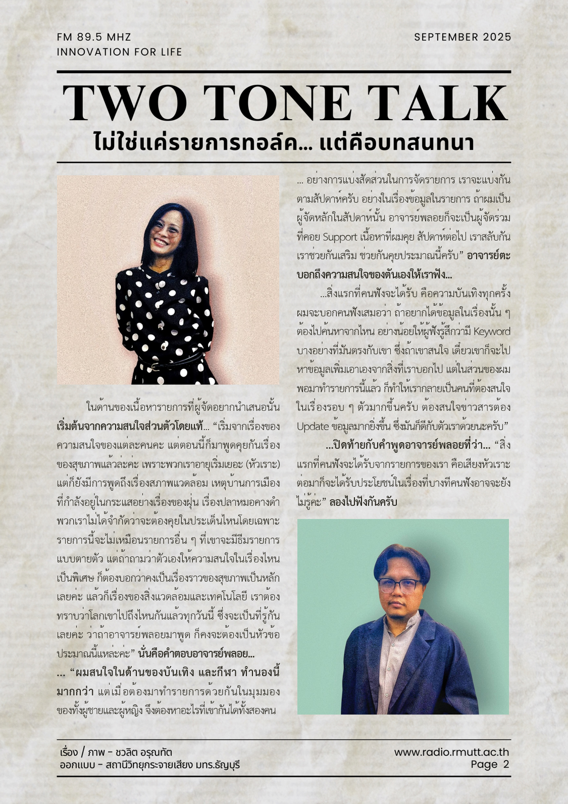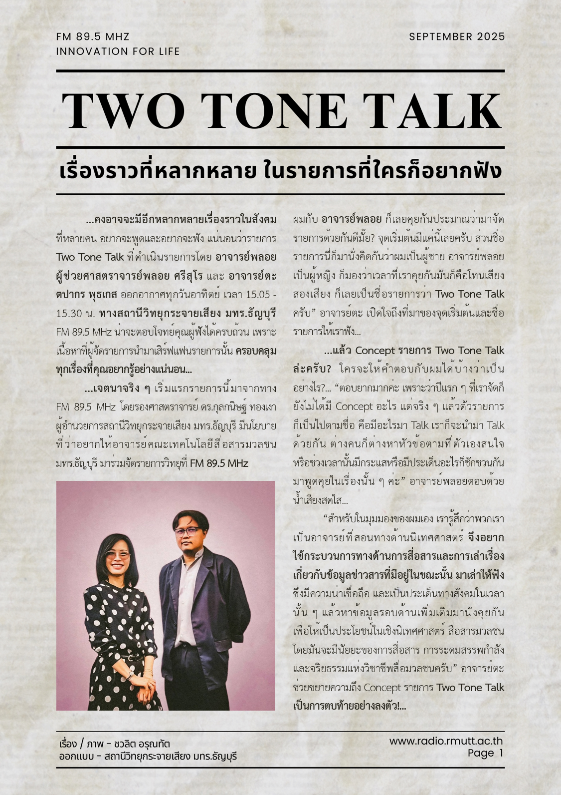 …เจตนาจริง ๆ เริ่มแรกรายการนี้มาจากทาง FM 89.5 MHz โดยรองศาสตราจารย์ ดร.กุลกนิษฐ์ ทองเงา ผู้อำนวยการสถานีวิทยุกระจายเสียง มทร.ธัญบุรี มีนโยบายที่ว่าอยากให้อาจารย์คณะเทคโนโลยีสื่อสารมวลชน มทร.ธัญบุรี มาร่วมจัดรายการวิทยุที่ FM 89.5 MHz ผมกับ อาจารย์พลอย ก็เลยคุยกันประมาณว่ามาจัดรายการด้วยกันดีมั้ย? จุดเริ่มต้นมีแค่นี้เลยครับ ส่วนชื่อรายการนี่ก็มานั่งคิดกันว่าผมเป็นผู้ชาย อาจารย์พลอยเป็นผู้หญิง ก็มองว่าเวลาที่เราคุยกันมันก็คือโทนเสียงสองเสียง ก็เลยเป็นชื่อรายการว่า Two Tone Talk ครับ” อาจารย์ตะ เปิดใจถึงที่มาของจุดเริ่มต้นและชื่อรายการให้เราฟัง…