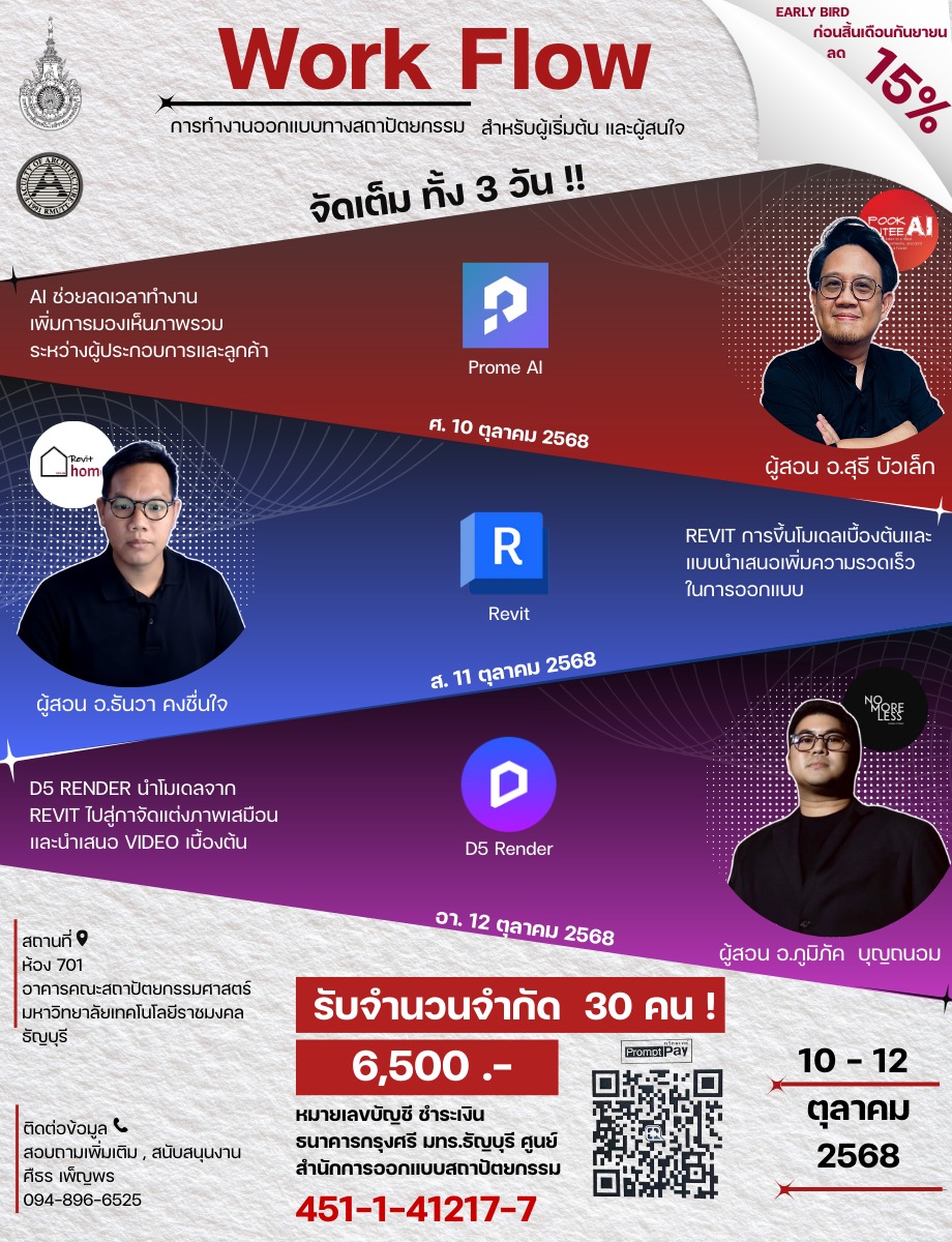ทั้งนี้ มีค่าสมัครอบรม 6,500 บาท บาท หากสมัครก่อนสิ้นเดือนกันยายนนี้ ลด 15 % รับจำนวนจำกัด เพียง 30 คน เท่านั้น ผู้ที่สนใจเข้าร่วมการอบรมสามารถเข้าดูข้อมูลเพิ่มเติมและสมัครอบรมได้ที่ Facebook คณะสถาปัตยกรรมศาสตร์ มหาวิทยาลัยเทคโนโลยีราชมงคลธัญบุรี โทรศัพท์ 094-896-6525