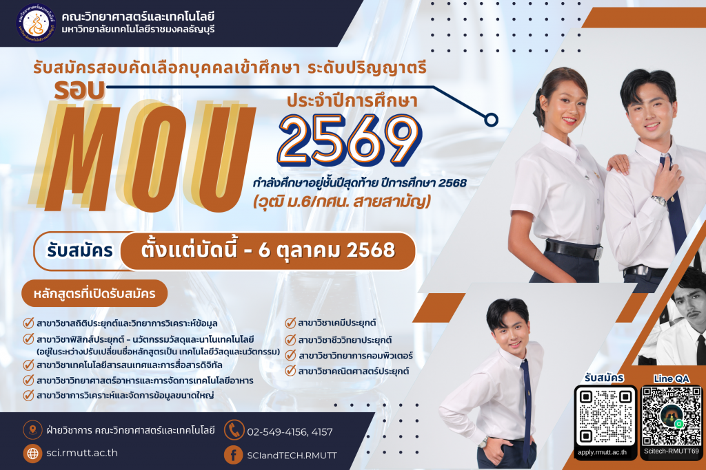 เปิดรับสมัครตั้งแต่บัดนี้ – 6 ตุลาคม 2568 สอบถามรายละเอียดเพิ่มเติมได้ที่ ฝ่ายวิชาการ คณะวิทยาศาสตร์และเทคโนโลยีมหาวิทยาลัยเทคโนโลยีราชมงคลธัญบุรี โทร. 0 – 2549 – 4156, 0 – 2549 – 4157