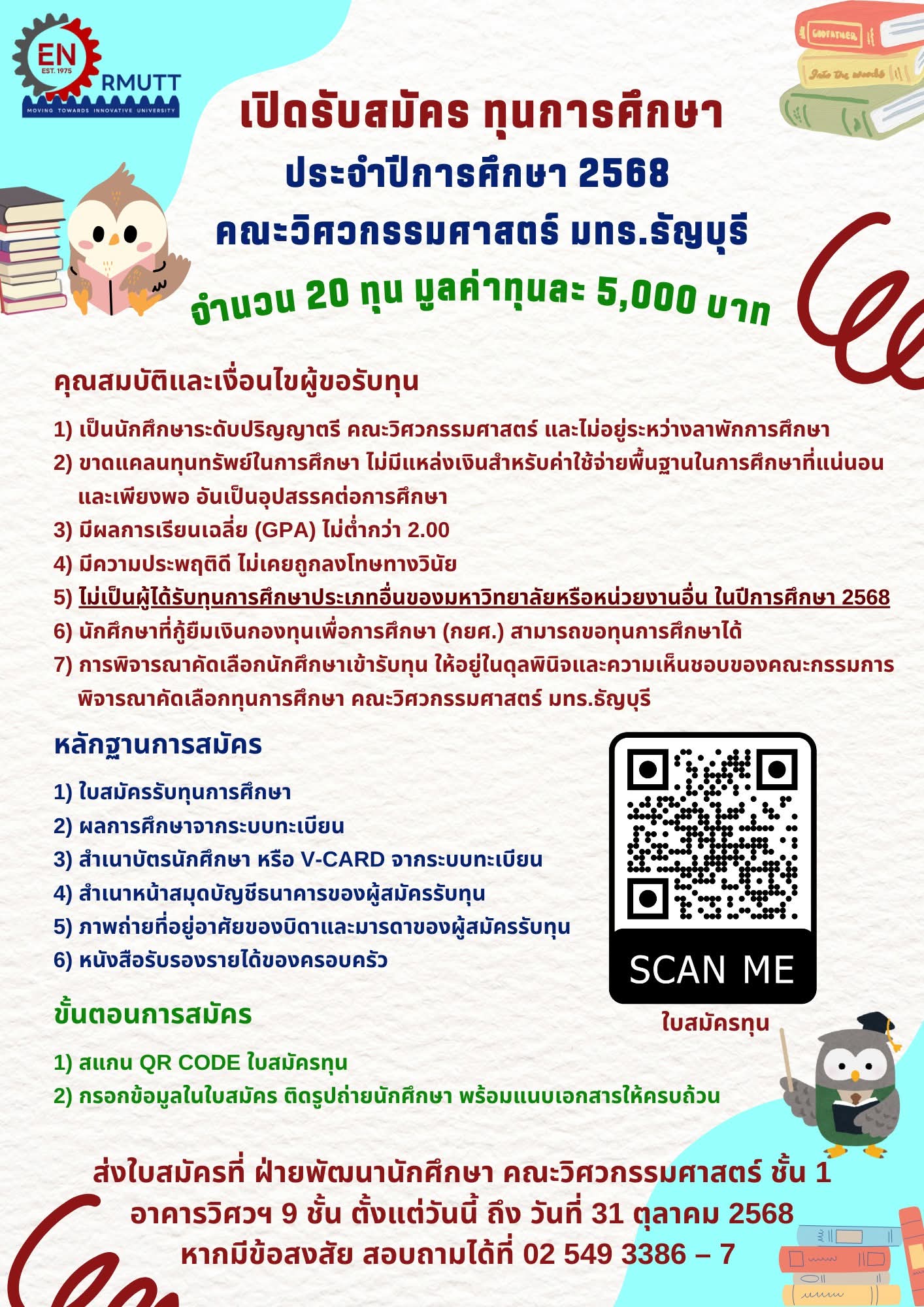 สมัครได้ตั้งแต่บัดนี้จนถึงวันที่ 31 ตุลาคม 2568 สอบถามรายละเอียดเพิ่มเติมได้ทาง Facebook ฝ่ายพัฒนาการศึกษา คณะวิศวกรรมศาสตร์ มทร.ธัญบุรี โทรศัพท์ 0 – 2549 – 3386 – 7