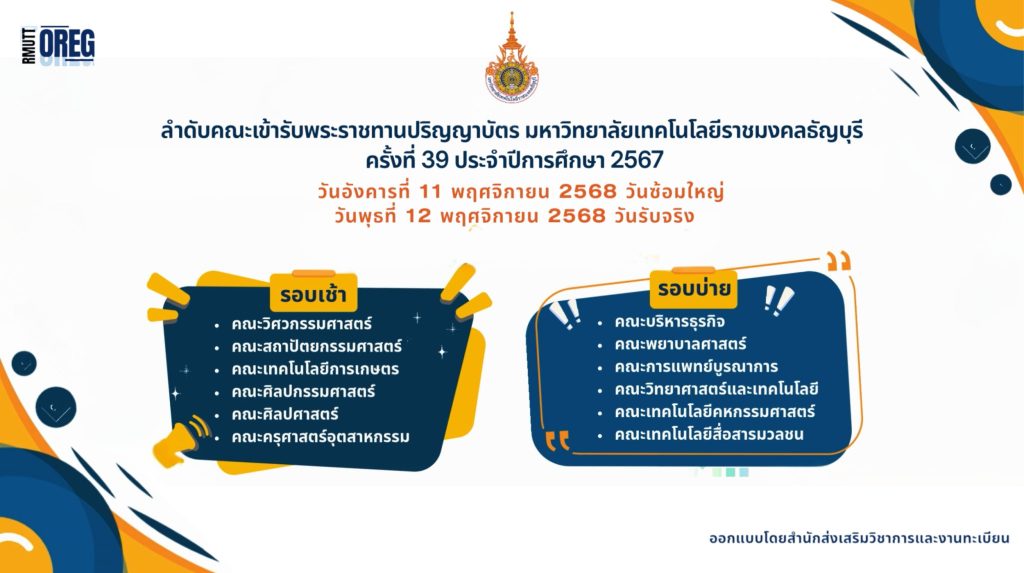โดยรอบเช้า เป็นบัณฑิตจาก 6 คณะ ได้แก่ คณะวิศวกรรมศาสตร์ คณะสถาปัตยกรรมศาสตร์ คณะเทคโนโลยีการเกษตร คณะศิลปกรรมศาสตร์ คณะศิลปศาสตร์ และ คณะครุศาสตร์อุตสาหกรรม