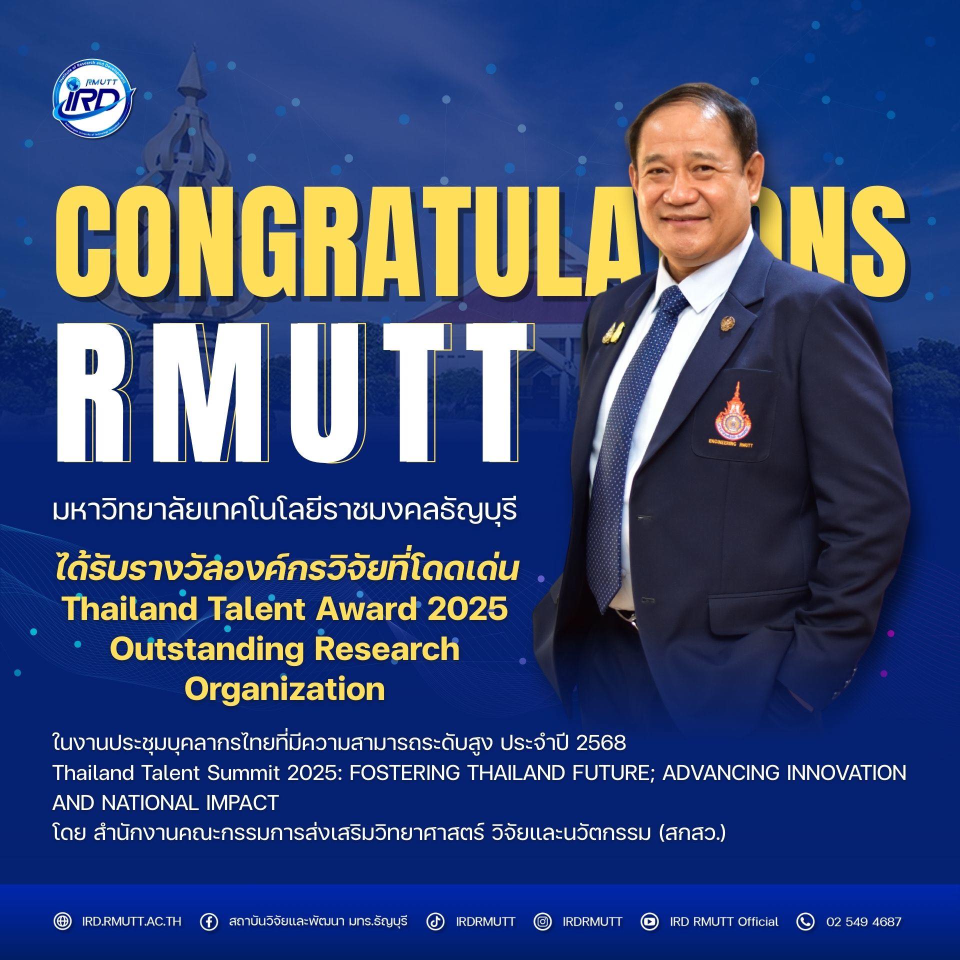 สำหรับงาน Thailand Talent Summit 2025 เป็นการรวมตัวครั้งยิ่งใหญ่ของนักวิจัยทั่วประเทศกว่า 2,000 คน ที่มาร่วมอัปเดตแนวโน้มวิทยาศาสตร์ วิจัย และนวัตกรรมจากหลากหลายสาขาตั้งแต่เกษตร อาหาร ชีววิทยา การแพทย์ สุขภาพ ไปจนถึงสังคม และมนุษย์ศาสตร์ วิศวกรรมศาสตร์ พร้อมสาระที่จะช่วยยกระดับประเทศไทยสู่อนาคตที่ยั่งยืน ช่วยผลักดัน และพัฒนานวัตกรรมประเทศไทยก้าวไกลสู่ระดับสากล โดย มทร.ธัญบุรี ถือเป็นหนึ่งใน 10 หน่วยงานทั่วประเทศที่ได้รับรางวัลในปี 2568 การันตีความโดดเด่นจากผลงานวิจัย และนวัตกรรมที่สร้างผลกระทบถึงระดับประเทศ ตอกย้ำบทบาทผู้นำด้านวิจัย และพัฒนาของสถาบันอย่างแท้จริง