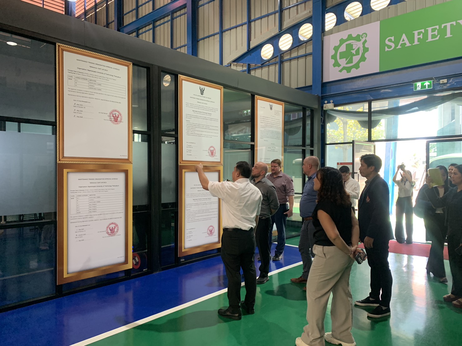 สำหรับคณะผู้เยี่ยมชมประกอบด้วย Professor จากประเทศเยอรมนี และ รองอธิการบดีจากมหาวิทยาลัยเทคโนโลยีพระจอมเกล้าเจ้าคุณทหารลาดกระบัง (สจล.) โดยมี ผู้ช่วยศาสตราจารย์ ดร.นิพนธ์ ทางทอง อาจารย์ประจำสถาบันการบิน มทร.ธัญบุรี ให้เกียรตินำชมอาคาร และบรรยายสรุปเกี่ยวกับแนวทางการปฏิบัติงานด้านการซ่อมบำรุงอากาศยาน (Aircraft Maintenance)