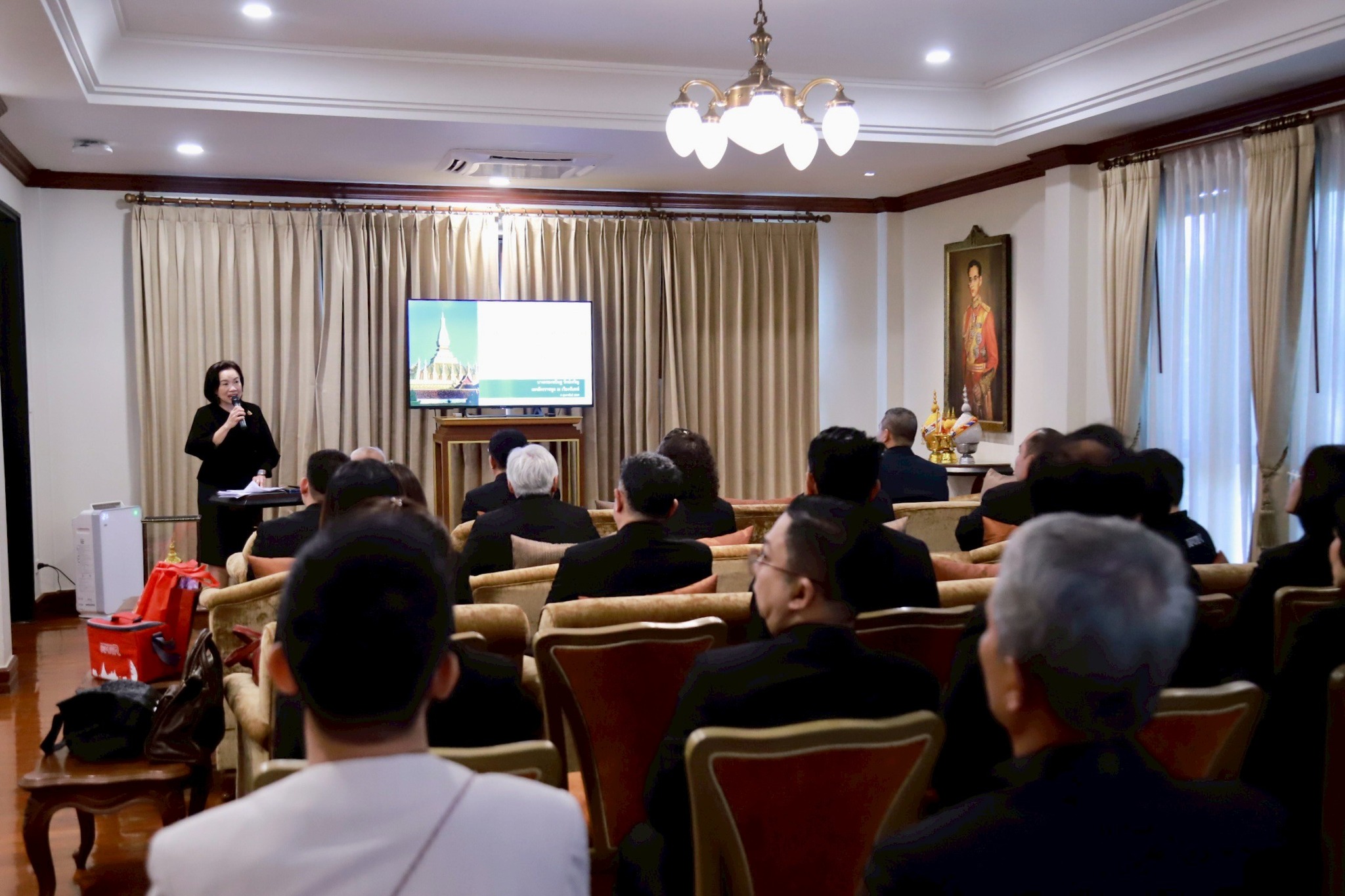คณะได้รับฟังการบรรยายเกี่ยวกับความสัมพันธ์เชิงยุทธศาสตร์เพื่อการเจริญเติบโตและการพัฒนาอย่างยั่งยืนระหว่างไทยและ สปป.ลาว ภายใต้แนวคิด “ญาติก็ใกล้ชิด มิตรก็ใกล้บ้าน” และ “กินข้าวร่วมนา กินปลาร่วมน้ำ” รวมถึงบทบาทของ สปป.ลาว ในการเป็นจุดเชื่อมโยงคมนาคมของภูมิภาค (Land bridge / Land link)