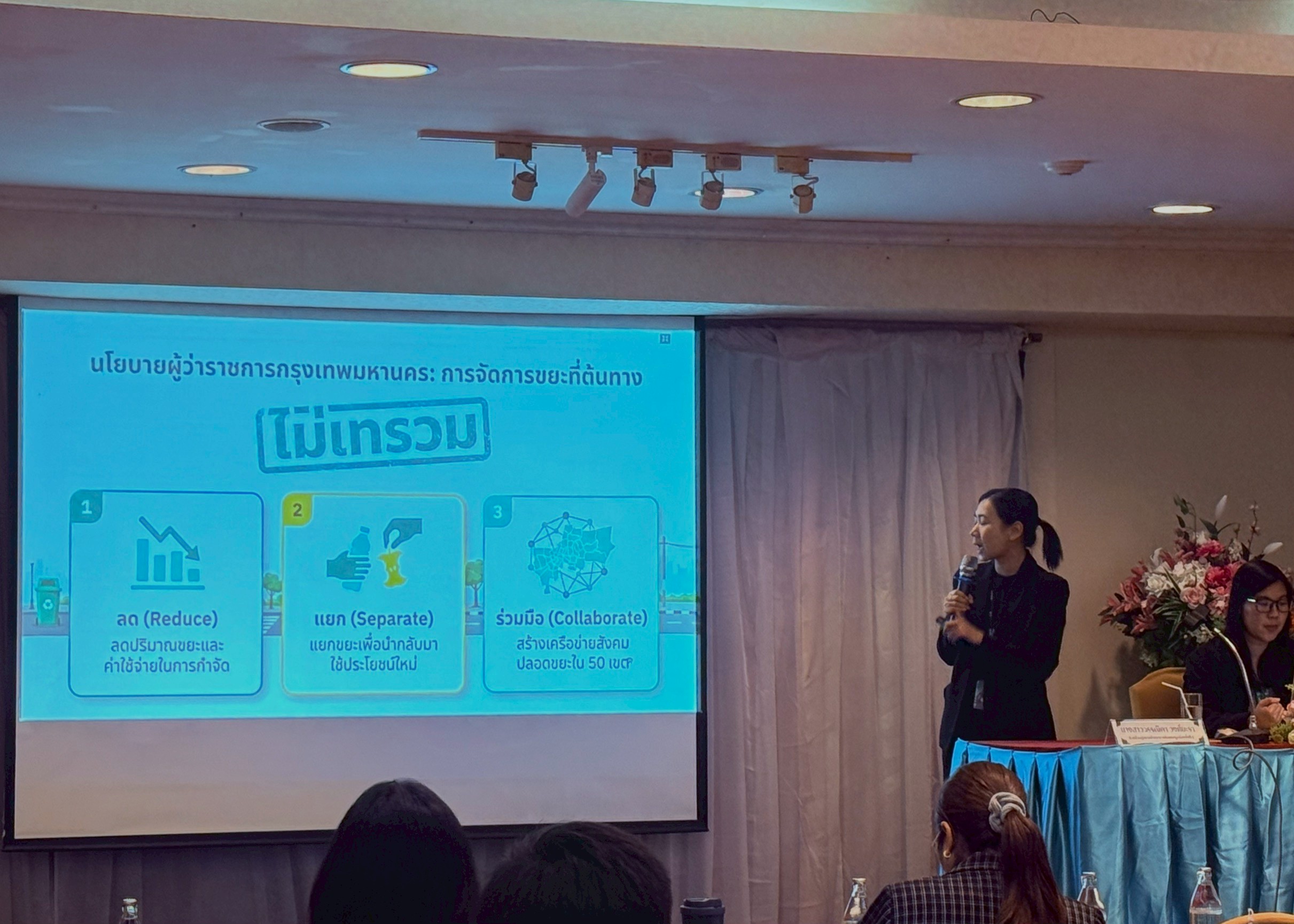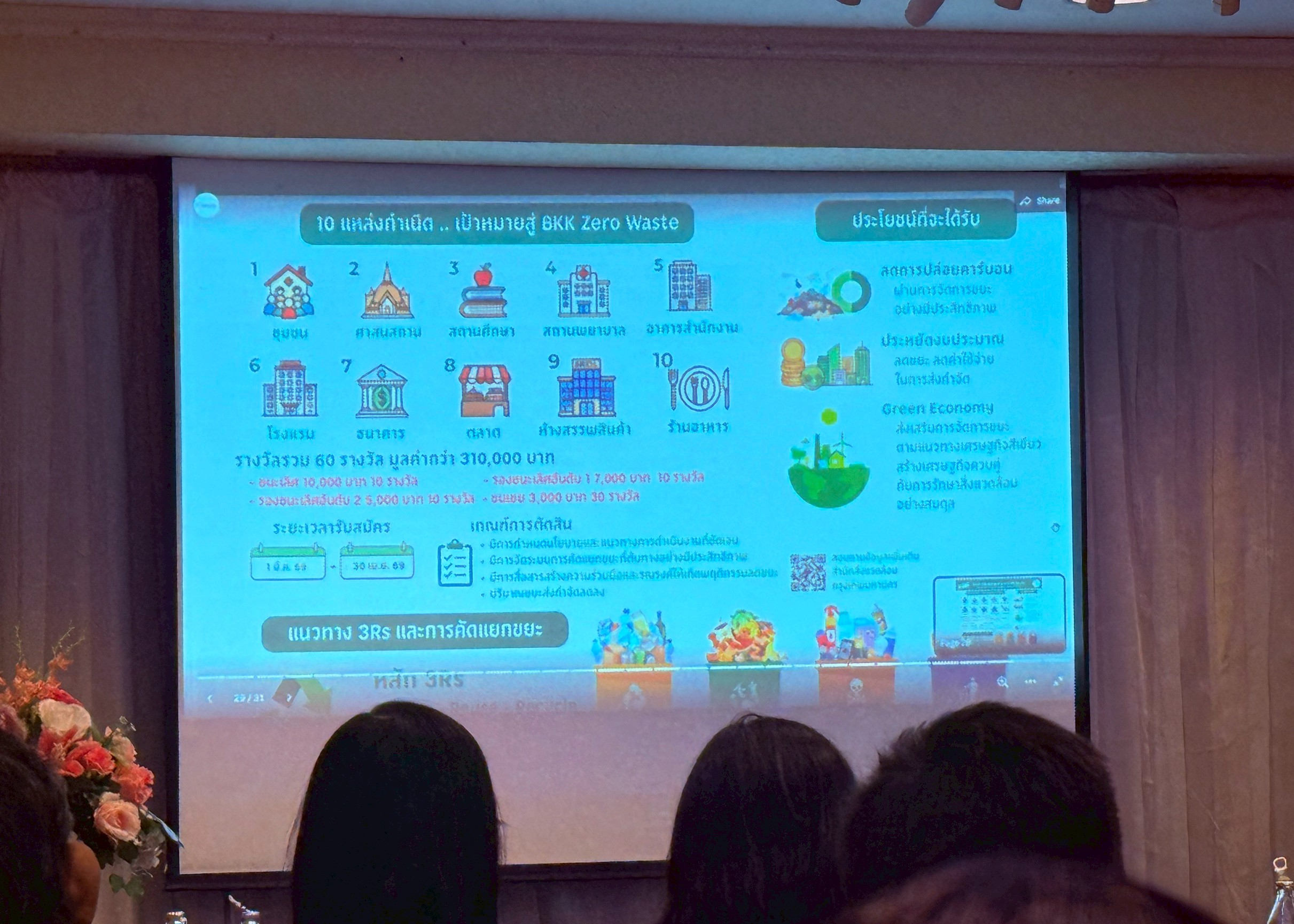 การอบรมครั้งนี้ มีการบรรยายที่น่าสนใจ ได้แก่ “ข้อบัญญัติใหม่การบริหารจัดการขยะมูลฝอยของกรุงเทพมหานคร” “แนะนําการลงทะเบียน BKK WASTE PAY” โดย นางสาววรรณิภา วงศ์ยะรา หัวหน้ากลุ่มงานพัฒนาการคัดแยกมูลฝอยพื้นที่ 1 นายประทีป ศรีบุญเรือง กลุ่มงานยุทธศาสตร์และนวัตกรรม สํานักสิ่งแวดล้อม กรุงเทพมหานคร