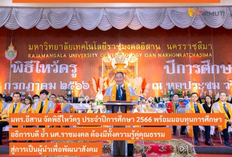 วันที่ 20 กรกฎาคม 2566 มหาวิทยาลัยเทคโนโลยีราชมงคลอีสาน โดย รองศาสตราจารย์ ดร.โฆษิต ศรีภูธร อธิการบดีมหาวิทยาลัยเทคโนโลยีราชมงคลอีสาน เป็นประธานในพิธีไหว้ครู ประจำปีการศึกษา 2566 ซึ่งจัดโดย สภานักศึกษา องค์การนักศึกษา สโมสรนักศึกษา และชมรมต่างๆ ที่ร่วมแรง ร่วมใจกันจัดขึ้น ณ หอประชุม วทัญญู ณ ถลาง โดยมี คณะผู้บริหารจากวิทยาเขตขอนแก่น วิทยาเขตสกลนคร วิทยาเขตสุรินทร์ คณาจารย์ อาจารย์ผู้เกษียนอายุราชการประจำปีงบประมาณ พ.ศ. 2566 พนักงาน เจ้าหน้าที่ และนักศึกษาเข่าวมพิธีกว่า 4,000 คน ภายใต้มาตรการป้องกัน COVID-19 ...