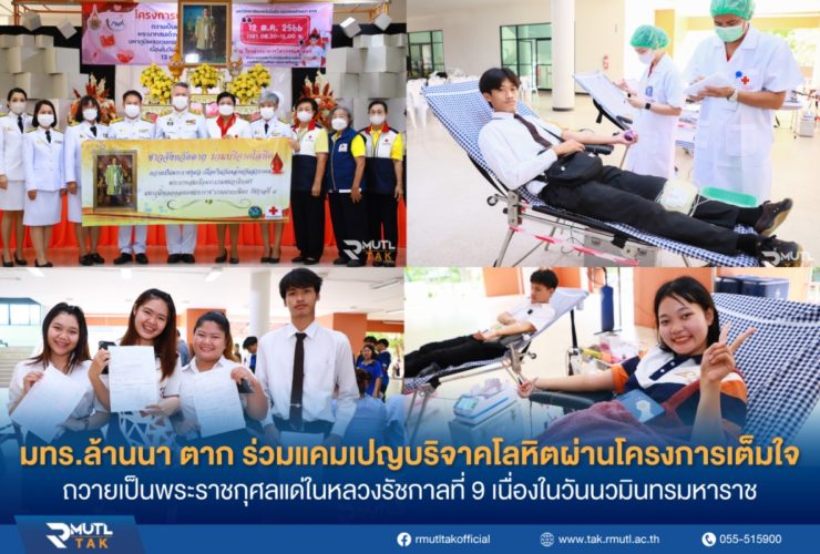 มหาวิทยาลัยเทคโนโลยีราชมงคล (มทร.) ล้านนา ตาก จัดกิจกรรมบริจาคโลหิตถวายเป็นพระราชกุศลแด่พระบาทสมเด็จพระบรมชนกาธิเบศร มหาภูมิพลอดุลยเดชมหาราช บรมนาถบพิตร เนื่องในวันนวมินทรมหาราช ผ่านกิจกรรมบริจาคโลหิต โครงการ “เต็มใจ” โดยมีผู้บริหาร บุคลากรและนักศึกษาร่วมบริจาคโลหิต . โครงการเต็มใจ จัดขึ้นจากความร่วมมือของศูนย์บริการโลหิตแห่งชาติ สภากาชาดไทย มูลนิธิดั่งพ่อสอน โครงการพัฒน์ (Plus) ภาคธุรกิจ และมทร.ล้านนา ตาก เพื่อกระตุ้นจิตสำนึกให้เยาวชน นิสิต นักศึกษา เกิดความสนใจและเสียสละเพื่อส่วนรวมผ่านการแข่งขันการทำกิจกรรมรณรงค์เชิญชวนประชาชนร่วมบริจาคโลหิต เนื่องจากภาพรวมการบริจาคโลหิตทั่วประเทศลดลง ส่งผลทำให้ปริมาณโลหิตสำรองไม่เพียงพอ จึงเกิดโครงการเต็มใจ เพื่อขอรับบริจาคโลหิต 1,000,000 ซี.ซี. ให้ได้ภายในปี 2566 โครงการเต็มใจ มีนักศึกษามทร.ล้านนา ตาก เข้าร่วมจำนวน 44 ...