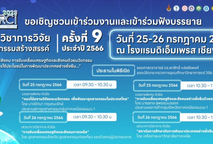 มหาวิทยาลัยเทคโนโลยีราชมงคล (มทร.) ล้านนา จัดการประชุมวิชาการวิจัยและนวัตกรรมสร้างสรรค์ ครั้งที่ 9 ประจำปี 2566 (The 9th Conference and Research Innovations: CRCI 2023) “…สู่วิจัยรับใช้สังคม การขับเคลื่อนเศรษฐกิจและสังคมด้วยนวัตกรรม เพื่อการใช้ประโยชน์ในการพัฒนาประเทศอย่างยั่งยืน” ระหว่างวันที่ 25-26 กรกฎาคม 2566 ณ ศูนย์ประชุมนานาชาติ โรงแรมดิเอ็มเพรส จังหวัดเชียงใหม่ . ภายในงานพบกับการนำเสนอผลงานวิจัย จากสาขาวิศวกรรมพลังงาน และเทคโนโลยี สาขาวิทยาศาสตร์กายภาพ สุขภาพ และชีวภาพ สาขาเทคโนโลยีเกษตร และอาหาร สาขาบริหารธุรกิจ และศิลปศาสตร์ สาขาศิลปกรรมและสถาปัตยกรรมศาสตร์ งานวิจัยรับใช้สังคม ...