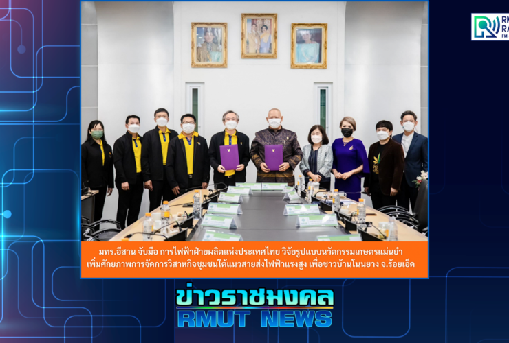 เมื่อวันที่ 25 มกราคม 2565 รศ.ดร.โฆษิต ศรีภูธร อธิการบดี มทร.อีสาน พร้อมคณะผู้บริหาร และสถาบันชุณหะวัณเพื่อการพัฒนาเอสเอ็มอีอย่างยั่งยืน และคณะนักวิจัย มทร.อีสาน ร่วมต้อนรับ คุณเกียนเรง เลียงจินดาถาวร ผู้อำนวยการฝ่ายปฏิบัติการภาคตะวันออกเฉียงเหนือ และคณะผู้บริหารการไฟฟ้าฝ่ายผลิตแห่งประเทศไทย ในพิธีลงนามความร่วมมือโครงการวิจัยศึกษารูปแบบนวัตกรรมเกษตรแม่นยำ เพื่อเพิ่มศักยภาพการจัดการวิสาหกิจชุมชนใต้แนวสายส่งไฟฟ้าแรงสูงสู่กิจการเพื่อสังคมอย่างยั่งยืน บ้านโนนยาง ตำบลขวาว อำเภอเสลภูมิ จังหวัดร้อยเอ็ด ณ ห้องประชุมแคแสด อาคารสำนักงานกิจการสภา มทร.อีสาน . สำหรับการทำความร่วมมือในครั้งนี้ เพื่อร่วมกันวิจัยพัฒนาต่อยอดนวัตกรรมปันแสง ไปสู่การทำเกษตรแม่นยำด้วยระบบ iOT โดยเปรียบเทียบการปลูกพืชระบบดั้งเดิมและระบบเกษตรแม่นยำสำหรับพืชเศรษฐกิจในชุมชน โดยมุ่งเน้นในการเพิ่มผลผลิต สร้างรายได้ และเพิ่มโอกาสให้กับเกษตรกรในการผลิตสินค้าเกษตร สร้างมูลค่าเพิ่มให้กับสินค้า ลดความเสียหาย และเสริมความสามารถของเกษตรกรในการผลิตสิ้นค้าเพื่อสุขภาพรองรับพฤติกรรมผู้บริโภคในปัจจุบัน รวมถึงร่วมกันศึกษาแนวทางการยกระดับมูลค่าผลิตภัณฑ์ท้องถิ่นให้สูงขึ้น ...