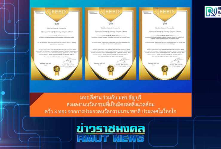 เมื่อวันที่ 8-12 กันยายน 2564 นักวิจัย มหาวิทยาลัยเทคโนโลยีราชมงคลธัญบุรี ร่วมกับ นักวิจัย มหาวิทยาลัยเทคโนโลยีราชมงคลอีสาน จัดทำงานวิจัยด้านวิศวกรรมโยธาที่เป็นมิตรกับสิ่งแวดล้อม โดยส่งผลงานเข้าร่วมการประกวดในการแข่งขันงานสัปดาห์นวัตกรรมแห่งแอฟริกา ประจำปี 2021 “The Innovation Week in Africa” (IWA 2021) ณ กรุงราบัต ราชอาณาจักรโมร็อกโก (แบบออนไลน์) โดยสามารถคว้ารางวัลระดับเหรียญทอง จากการประกวดได้ถึง 3 รายการ ได้แก่ . รางวัลเหรียญทอง (Gold Medal) จากนวัตกรรม แผ่นอัดจากซองอลูมิเนียมฟอยด์สำหรับงานตกแต่งและเฟอร์นิเจอร์ (Compression sheets from aluminium foil ...