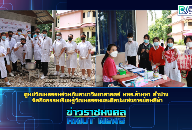 ศูนย์วัฒนธรรม กองการศึกษา ร่วมกับสาขาวิทยาศาสตร์ คณะวิทยาศาสตร์และเทคโนโลยีการเกษตร มหาวิทยาลัยเทคโนโลยีราชมงคล (มทร.) ล้านนา ลำปาง จัดกิจกรรมย้อมผ้าด้วยสีธรรมชาติ ภายใต้โครงการวันวัฒนธรรม “สืบสานล้านนาภูมิปัญญาท้องถิ่น” เมื่อวันที่ 16 กรกฎาคม 2564 ณ อาคารปฏิบัติการกลาง มทร.ล้านนา ลำปาง . การจัดกิจกรรมดังกล่าวเป็นหนึ่งในพันธกิจด้านการทำนุบำรุงศิลปะวัฒนธรรมและสิ่งแวดล้อม เพื่อให้ผู้เข้าร่วมอบรมได้เรียนรู้วิธีการและกระบวนการการย้อมผ้าด้วยสีธรรมชาติตั้งแต่เริ่มเตรียมวัตถุดิบ การย้อมสีและการดูแลผ้าหลังการย้อมสี อีกทั้งเป็นการบูรณาการ การจัดการเรียนการสอนร่วมกันของคณะบริหารธุรกิจและศิลปศาสตร์ คณะวิทยาศาสตร์และเทคโนโลยีการเกษตร และคณะวิศวกรรมศาสตร์ โดยมีอาจารย์สาขาวิทยาศาสตร์เป็นวิทยากรถ่ายทอดองค์ความรู้ โดยจัดกิจกรรมภายใต้มาตรการเฝ้าระวังสถานการณ์การแพร่ระบาดของโควิด 19 . ธริษตรี ธนรัตนพิมลกุล วิทยุราชมงคลล้านนา รายงาน ...