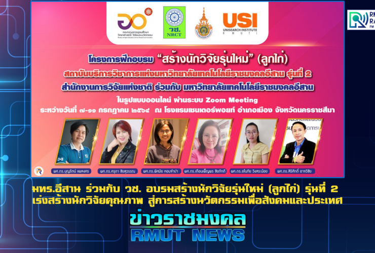 สถาบันบริการวิชาการแห่งมหาวิทยาลัยเทคโนโลยีราชมงคลอีสาน (USI RMUTI) ร่วมกับ สำนักงานการวิจัยแห่งชาติ (วช.) จัดโครงการฝึกอบรม “การสร้างนักวิจัยรุ่นใหม่” (ลูกไก่) รุ่นที่ 2 ในรูปแบบออนไลน์ ผ่านระบบ Zoom Meeting เมื่อวันที่ 7 กรกฎาคม 2564 โดยมี นายสมปรารถนา สุขทวี รองผู้อำนวยการสำนักงานการวิจัยแห่งชาติ ให้เกียรติเป็นประธานเปิดโครงการ ซึ่งมี รองศาสตราจารย์ ดร.โฆษิต ศรีภูธร รักษาราชการแทน อธิการบดีมหาวิทยาลัยเทคโนโลยีราชมงคลอีสาน กล่าวต้อนรับ และมี นางสาวจุฬาลักษณ์ พลเสนา ผู้อำนวยการสถาบันบริการวิชาการแห่ง มทร.อีสาน กล่าวรายงานวัตถุประสงค์การดำเนินโครงการ ณ โรงแรมเซนเตอร์พอยต์โฮเทล เทอมินอล ...