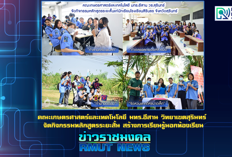 เมื่อวันที่ 6 มีนาคม 2564 คณะเกษตรศาสตร์และเทคโนโลยี มหาวิทยาลัยเทคโนโลยีราชมงคลอีสาน วิทยาเขตสุรินทร์ จัดกิจกรรมอบรมหลักสูตรระยะสั้นให้แก่ นักเรียนชั้นมัธยมศึกษาปีที่ 3 โรงเรียนสิรินธร จังหวัดสุรินทร์ จำนวน กว่า 170 คน โดยคณะเกษตรศาสตร์และเทคโนโลยี มทร.อีสาน วข.สุรินทร์ ได้จัดกิจกรรมอบรมให้ความรู้ จำนวน 4 กิจกรรม ได้แก่ . – กิจกรรมการจัดสวนแคคตัสขนาดเล็ก วิทยากรโดย อาจารย์วสา วงศ์สุขแสวง – กิจกรรมทำผ้ามัดย้อม วิทยากรโดยอาจารย์ทัศนียา นิลฤทธิ์ – กิจกรรมทำสายคล้องแมสก์หน้ากากอนามัย วิทยากรโดย อาจารย์รัตนเรขา อัจฉริยะพิทักษ์ – ...