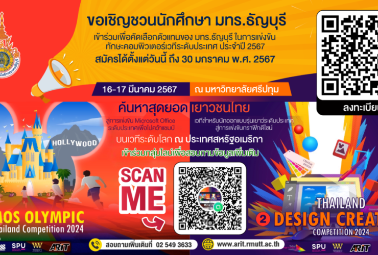 สำนักวิทยบริการและเทคโนโลยีสารสนเทศ มทร.ธัญบุรี ขอเชิญชวนนักศึกษา มทร.ธัญบุรี เข้าร่วมเพื่อคัดเลือกตัวแทนของมหาวิทยาลัยเทคโนโลยีราชมงคลธัญบุรี ในการแข่งขันทักษะคอมพิวเตอร์เวทีระดับประเทศ ภายใต้ชื่อโครงการ Thailand Design Creator Competition 2024 สำหรับนักศึกษาที่มีความรู้และทักษะด้านการออกแบบด้วยโปรแกรมคอมพิวเตอร์ ในระดับดี และ โครงการ MOS OLYMPIC Thailand Competition 2024 สำหรับนักศึกษาที่มีความรู้และทักษะการใช้งานโปรแกรมชุด Microsoft Office (Word, Excel, PowerPoint 2019) ในระดับดี ทั้งนี้ มหาวิทยาลัยฯ มีโควตายกเว้นค่าธรรมเนียมการสมัครและเข้าร่วมแข่งขัน ให้กับผู้ที่ได้รับการคัดเลือกเป็นตัวแทนของ มทร.ธัญบุรี จำนวนโครงการละ 10 ที่นั่ง รวม 20 ที่นั่ง ...