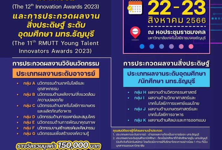 มหาวิทยาลัยเทคโนโลยีราชมงคลธัญบุรี เตรียมจัดโครงการยกระดับสิ่งประดิษฐ์และนวัตกรรมสู่สากล (RMUTT Elevate Innovation & Invention Awards) ภายใต้ งานมหกรรมวิจัยและนวัตกรรม มทร.ธัญบุรี เพื่อสร้างการเปลี่ยนแปลงอย่างยั่งยืน (RMUTT Research and Innovation Fair for Sustainable Change2023) ระหว่างวันที่ 22-23 สิงหาคม 2566 ณ หอประชุมราชมงคล มหาวิทยาลัยเทคโนโลยีราชมงคลธัญบุรี จ.ปทุมธานี โดยเป็นการจัดกิจกรรมที่ 2 การประกวดผลงานวิจัยและนวัตกรรม ระดับอาจารย์ และการประกวดผลงานสิ่งประดิษฐ์ ระดับอุดมศึกษา นักศึกษา มทร.ธัญบุรี ชิงรางวัลรวมมูลค่ากว่า 150,000 บาท ผู้ที่สนใจสอบถามเพิ่มเติมได้ที่ ...