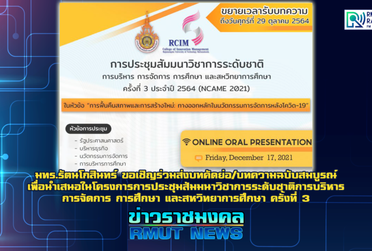 วิทยาลัยนวัตกรรมการจัดการ มหาวิทยาลัยเทคโนโลยีราชมงคลรัตนโกสินทร์ ขอเชิญร่วมส่งบทคัดย่อ/บทความฉบับสมบูรณ์ เพื่อนำเสนอในโครงการการประชุมสัมมนาวิชาการระดับชาติการบริหาร การจัดการ การศึกษา และสหวิทยาการศึกษา ครั้งที่ ๓ ประจำปี ๒๕๖๔ (NCAME 2021) ในหัวข้อ“การฟื้นคืนสภาพและการสร้างใหม่ ทางออกหลักในนวัตกรรมการจัดการหลังโควิด-19” ในวันศุกร์ที่ ๑๗ ธันวาคม ๒๕๖๔ ในรูปแบบออนไลน์ . หัวข้อการประชุม – รัฐประศาสนศาสตร์ – บริหารธุรกิจ – นวัตกรรมการจัดการ – การบริหารการศึกษา ค่าลงทะเบียน บุคคลทั่วไป อาจารย์ นักวิจัย ทั้งภายในและภายนอก 1,200 บาท นิสิต นักศึกษา ทั้งภายในและภายนอก ...