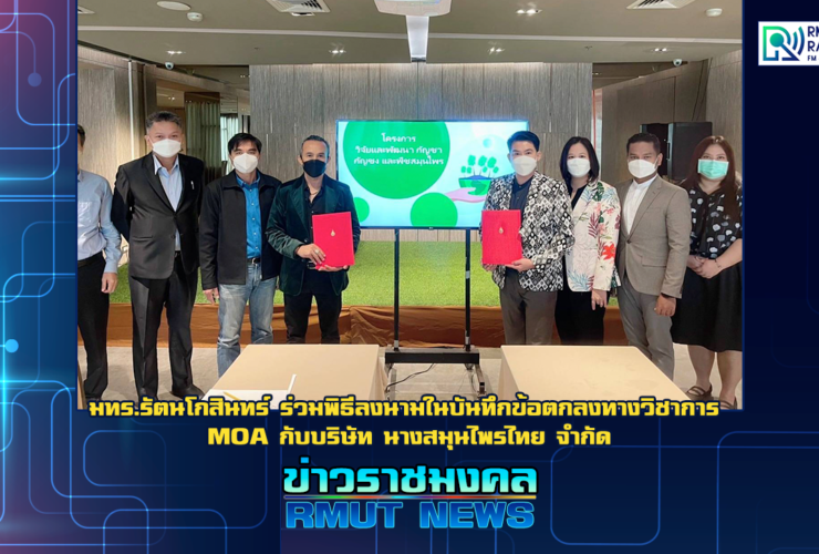 มทร.รัตนโกสินทร์ โดย ผศ.ศิวะ วสุนธราภิวัฒก์ อธิการบดี มอบหมายให้ ผศ.ดร.อาคีรา ราชเวียง รองอธิการบดี พร้อมด้วย อ.อภิเสฏฐ์ สุวรรณสะอาด ผู้อำนวยการกองพัฒนานักศึกษา และดร.ธีรินทร์ คงพันธุ์ รองคณบดีฝ่ายวิชาการและวิจัย คณะวิศวกรรมศาสตร์ ร่วมพิธีลงนามบันทึกข้อตกลงทางวิชาการ (MOA) “โครงการวิจัยและพัฒนาพืชกัญชา กัญชง และสมุนไพรสายพันธุ์ต่างประเทศร่วมกับการพัฒนาสายพันธุ์ใหม่ ที่เหมาะสมต่อภาคเหนือ กลาง และตะวันออกเฉียงเหนือ” ระหว่าง มทร.รัตนโกสินทร์ กับ บริษัท นางสมุนไพรไทย จำกัด ณ โรงแรมแซนด์ โมราดา จ.ชลบุรี . สำนักงานประชาสัมพันธ์มหาวิทยาลัยเทคโนโลยีราชมงคลรัตนโกสินทร์ : รายงาน ...