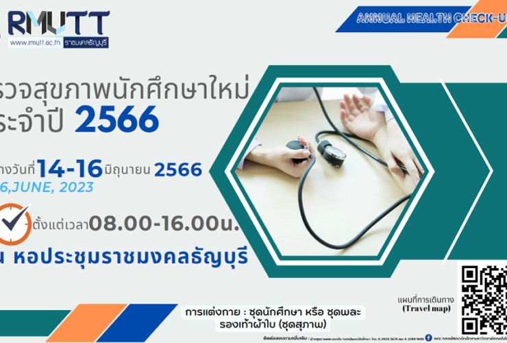 กองพัฒนานักศึกษา มทร.ธัญบุรี แจ้งตรวจสุขภาพนักศึกษาใหม่ ปีการศึกษา 2566 ครั้งที่ 1 ระหว่างวันที่ 14-16 มิถุนายน 2566 เวลา 08.00 – 16.00 น. และครั้งที่ 2 รอบเก็บตก วันที่ 7 กรกฎาคม 2566 เวลา 08.00 – 16.00 น. ณ หอประชุม มทร.ธัญบุรี . ทั้งนี้ มหาวิทยาลัยจะดำเนินการจัดทำบัตรประจำตัวนักศึกษา ให้บริการโดยธนาคารกรุงศรีอยุธยา จึงขอแจ้งให้นักศึกษาเตรียมเอกสารมาด้วย ดังนี้ สำเนาบัตรประจำตัวประชาชน 2 ใบ, ...