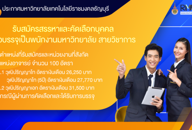 มหาวิทยาลัยเทคโนโลยีราชมงคลธัญบุรี เปิดรับสมัครสรรหาและคัดเลือกบุคคลเพื่อบรรจุเป็นพนักงานมหาวิทยาลัย สายวิชาการ ตําแหน่งอาจารย์ จํานวน 100 อัตรา วุฒิปริญญาโท อัตราเงินเดือน 26,250 บาท วุฒิปริญญาโท ( 5 ปี ) อัตราเงินเดือน 27,770 บาท วุฒิปริญญาเอก อัตราเงินเดือน 31,500 บาท . จะต้องปฏิบัติงานด้านภาระงานสอน งานวิจัย งานบริการทางวิชาการ และงานทํานุบํารุงศิลปวัฒนธรรม หรืองานอื่นใดที่กําหนดให้เป็นภาระงานตามประกาศสภามหาวิทยาลัยเทคโนโลยีราชมงคลธัญบุรี เรื่อง หลักเกณฑ์ภาระงานขั้นต่ําของคณาจารย์ประจํามหาวิทยาลัย สําหรับผู้ผ่านการคัดเลือกและได้รับการบรรจุตําแหน่งอาจารย์ วุฒิปริญญาเอก และสําเร็จการศึกษาจากสถาบันการศึกษาที่ ก.พ. รับรอง มหาวิทยาลัยจะจ่ายเงินเพิ่มพิเศษเดือนละไม่เกิน 5,000 บาท จนกว่าจะได้รับแต่งตั้งให้ดํารงตําแหน่งผู้ช่วยศาสตราจารย์ ...