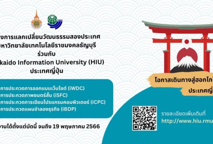 มหาวิทยาลัยเทคโนโลยีราชมงคลธัญบุรี หรือ มทร.ธัญบุรี ขอเชิญนักศึกษาเข้าร่วมโครงการแลกเปลี่ยนวัฒนธรรมสองประเทศ ระหว่าง มหาวิทยาลัยเทคโนโลยีราชมงคลธัญบุรี RMUTT ร่วมกับ Hokkaido Information University (HIU) ผ่านการประกวดผลงานใน 4 โครงการ ได้แก่ 1.โครงการประกวดการออกแบบเว็บไซต์ (iWDC) 2.โครงการประกวดภาพยนตร์สั้น (iSFC) 3.โครงการประกวดการเขียนโปรแกรมคอมพิวเตอร์ (iCPC) และ 4.โครงการประกวดแผนธุรกิจ (iBDP) โดยมีกำหนดการเข้าร่วมกิจกรรม คือ Workshop 1 : กิจกรรม ณ ประเทศญี่ปุ่น 28 สิงหาคม – 5 กันยายน 2566 Workshop ...