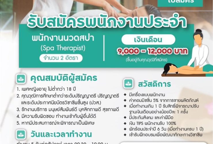 คณะการแพทย์บูรณาการ มหาวิทยาลัยเทคโนโลยีราชมงคลธัญบุรี เปิดรับสมัครพนักงานนวดสปา ประจำบัวสปา จำนวน 2 อัตรา เพศหญิง อายุ 18 ปีขึ้นไป เงินเดือน 8,500 – 12,000 บาท (ขึ้นอยู่กับประสบการณ์) ทำงาน 5 วันต่อสัปดาห์ เวลา 09.30 – 19.00 น. และหยุดตามประกาศวันหยุดของบัวสปา สอบถามรายละเอียดเพิ่มเติมได้ที่ 0 2592 1989 ต่อ 1111 ในวันและเวลาราชการ . เรียบเรียงและรายงานโดย อาทิตยา ปักกะทานัง ...
