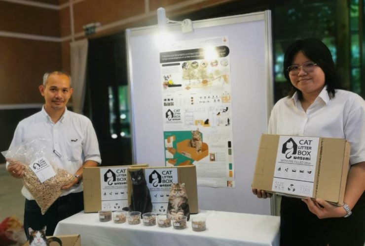 นางสาววาสนา มากคำมี นักศึกษาชั้นปีที่ 4 สาขาออกแบบผลิตภัณฑ์ คณะศิลปกรรมศาสตร์ มหาวิทยาลัยเทคโนโลยีราชมงคลธัญบุรี ออกแบบและพัฒนาชุดกระบะทรายแมวจากกากชา เพื่อการใช้งานนอกสถานที่ โดยมีอาจารย์ศรศิลป์ โสภณสกุลวงศ์ เป็นอาจารย์ที่ปรึกษา โดย วาสนา กล่าวถึงที่มาว่า ปัจจุบันการเลี้ยงแมวกำลังเป็นที่นิยม ด้วยเป็นสัตว์ที่มีขนาดเล็กและมีการดูแลที่ง่ายใช้พื้นที่ไม่เยอะ แต่ปัญหาหลักของการเลี้ยงแมวที่พบเจอ คือการหมักหมม ที่ทำให้เกิดกลิ่นจากสิ่งปฏิกูลและการขนย้ายกระบะทรายแมวสำหรับเดินทางในรถ เนื่องด้วยแมวจะมีนิสัยขับถ่ายในดินหรือทราย และจะฝังกลบเพื่อไม่ให้เกิดกลิ่น จึงสนใจออกแบบผลิตภัณฑ์ที่เกี่ยวกับแมว เกิดเป็นผลิตภัณฑ์ที่ชื่อว่า cat Little Box จากแบรนด์วาซูมิ . โดย กระบะทรายและทรายแมว สูตรกากชาคามิเลีย ตราวาซูมิ เป็นกระบะทรายพร้อมทรายแมวกากชาคามิเลีย ผสมไม้สน ซึ่งกากชาน้ำคามิเลีย เป็นกากชาที่ได้จากการสลัดเอาน้ำมันไปใช้เป็นน้ำมันสำหรับปรุงอาหาร มีสารซาโปนินที่ช่วยฆ่าเชื้อราเเละลดกลิ่นอับ //ทรายแมวสูตรกากชาคามิเลีย มีคุณสมบัติดูดซับของเสียได้ดี ...
