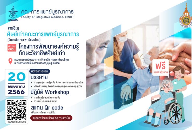 คณะการแพทย์บูรณาการ มหาวิทยาลัยเทคโนโลยีราชมงคลธัญบุรี ขอเชิญศิษย์เก่าคณะการแพทย์บูรณาการ (วิทยาลัยการแพทย์แผนไทย) เข้าร่วมอบรม “โครงการพัฒนาองค์ความรู้ทักษะวิชาชีพศิษย์เก่า”? วันที่ 20 พฤษภาคม 2566 (Onsite) ณ คณะการแพทย์บูรณาการ (วิทยาลัยการแพทย์แผนไทย) มหาวิทยาลัยเทคโนโลยีราชมงคลธัญบุรี ศูนย์รังสิต อบรมฟรี ไม่มีค่าใช้จ่าย . โดยมีหัวข้อการอบรม ดังนี้ ภาคทฤษฎี ได้แก่ การดูแลสุขภาพผู้สูงวัย ด้วยศาสตร์การแพทย์แผนไทย และ ผลิตภัณฑ์สมุนไพรกับการดูแลสุขภาพของผู้สูงวัย ภาคปฏิบัติ กิจกรรม Workshop ได้แก่ การทำเซรั่มสมุนไพรชะลอวัย และ การทำน้ำมันนวดสมุนไพร เปิดรับสมัครเพียง 50 คนเท่านั้น ดูข้อมูลและสมัครเข้าอบรมได้ที่ Facebook คณะการแพทย์บูรณาการ ...