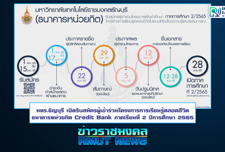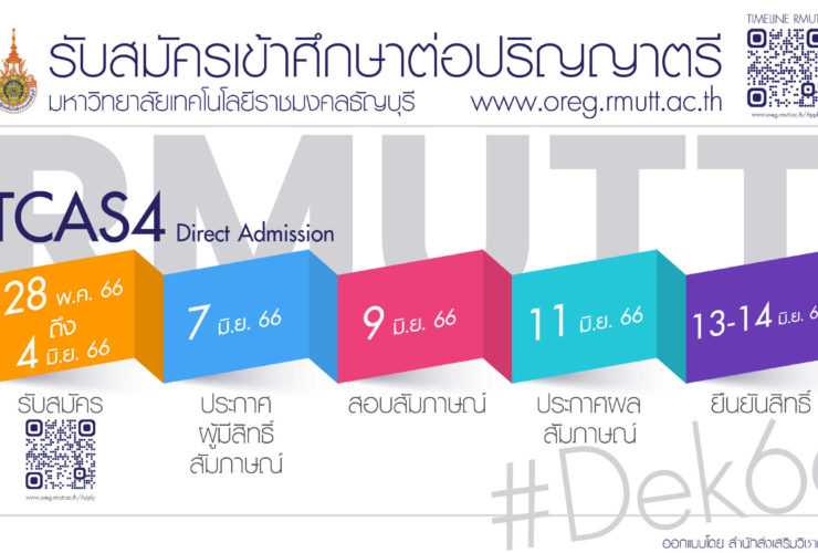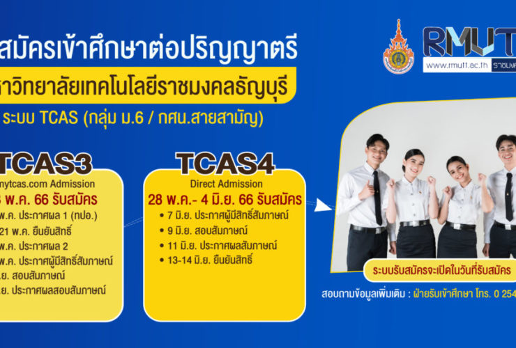 มหาวิทยาลัยเทคโนโลยีราชมงคลธัญบุรี เปิดรับสมัครนักศึกษาผ่านระบบ TCAS4 Direct Admission ระหว่างวันที่ 28 พ.ค. – 4 มิ.ย.2566 ประกาศชื่อผู้มีสิทธิ์สอบสัมภาษณ์ 7 มิ.ย.สอบสัมภาษณ์ 9 มิ.ย. ประกาศผลสัมภาษณ์ 11 มิ.ย. ยืนยันสิทธิ์ Mytcas.com 13-14 มิ.ย. . คุณสมบัติผู้สมัคร สำเร็จการศึกษาแล้ว ระดับชั้นมัธยมศึกษาปีที่ 6 / กศน. สามัญ หรือกำลังศึกษาอยู่ภาคการศึกษาสุดท้าย ปีการศึกษา 2565 โดยคาดว่าจะสำเร็จการศึกษา และได้รับวุฒิการศึกษาจากสถานศึกษาทั่วประเทศ ศึกษาระเบียบการรับสมัครและสมัครได้ที่ www.oreg.rmutt.ac.th เมนู สมัครเข้าศึกษาต่อ ...
