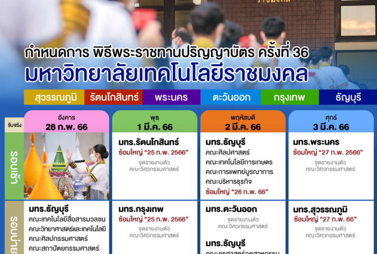 มหาวิทยาลัยเทคโนโลยีราชมงคลทั้ง 6 แห่ง เตรียมจัดพิธีพระราชทานปริญญาบัตรมหาวิทยาลัยเทคโนโลยีราชมงคล ครั้งที่ 36 ประจำปีการศึกษา 2564 ณ หอประชุมราชมงคล มหาวิทยาลัยเทคโนโลยีราชมงคลธัญบุรี ต.คลองหก อ.คลองหลวง จ.ปทุมธานี มีกำหนด การ คือ การซ้อมใหญ่ วันที่ 24-27 กุมภาพันธ์ 2566 และ พิธีรับพระราชทานปริญญาบัตร วันที่ 28 กุมภาพันธ์ – 3 มีนาคม 2566 . โดยมีจำนวนบัณฑิตที่เข้ารับพระราชทานปริญญาบัตร ดังนี้ มหาวิทยาลัยเทคโนโลยีราชมงคลธัญบุรี 6,314 ราย มหาวิทยาลัยเทคโนโลยีราชมงคลกรุงเทพ 2,498 ราย ...