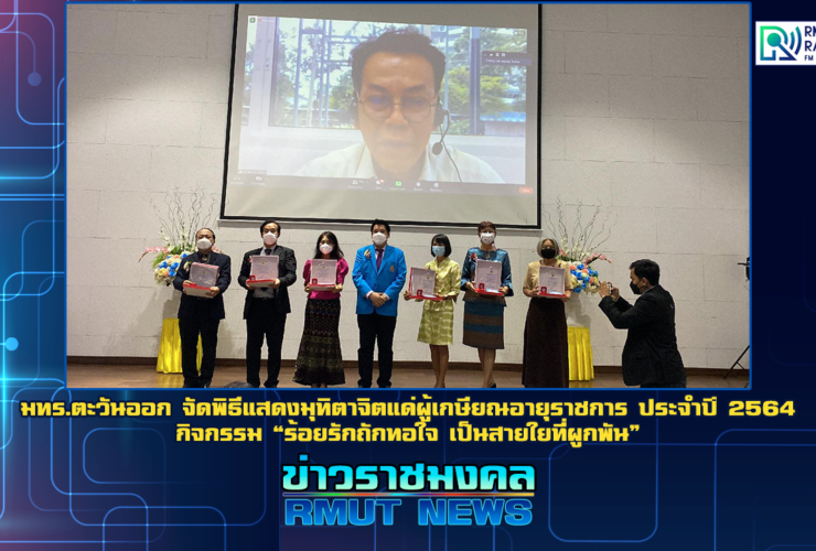 วันที่ 28 กันยายน 2564 มหาวิทยาลัยเทคโนโลยีราชมงคลตะวันออกจัดพิธีแสดงมุทิตาจิตแด่ผู้เกษียณอายุราชการ ประจำปี 2564 “ร้อยรักถักทอใจ เป็นสายใยที่ผูกพัน” ณ ห้องประชุม 1 อาคารสถาบันบัว มหาวิทยาลัยเทคโนโลยีราชมงคลตะวันออก และถ่ายทอดสดเข้าร่วมงานผ่านสื่ออิเล็กทรอนิกส์ ระบบ Zoom Application โดยในปีนี้มีบุคลากรเกษียณอายุฯ จำนวน 22 ท่าน โดยมีคณะผู้บริหาร บุคลากรทั้งสายวิชาการและสายสนับสนุน เข้าร่วมแสดงมุทิตาจิต . ในการนี้ รองศาสตราจารย์ ดร.ฤกษ์ชัย ฟูประทีปศิริ รักษาราชการแทนอธิการบดีมหาวิทยาลัยเทคโนโลยีราชมงคลตะวันออก เป็นประธานในพิธี กล่าวแสดงมุทิตาจิตสดุดีผู้เกษียณอายุราชการ มอบโล่ประกาศเกียรติคุณและของที่ระลึกแด่ผู้เกษียณอายุราชการและกล่าวขอบคุณผู้เกษียณอายุราชการ ที่ได้ทุ่มเทกำลังกายกำลังใจ ขับเคลื่อนองค์กรให้ก้าวหน้าสู่เป้าหมายที่วางไว้ จนครบวาระเกษียณ ต่อจากนั้นร่วมรับชมวีดิทัศน์แนะนำตัวผู้เกษียณอายุราชการและรับฟังความในใจจากผู้เกษียณอายุฯ ทั้งนี้ ให้ดำเนินการตามมาตรการการป้องกันการแพร่ระบาดของโรคติดเชื้อไวรัสโคโรนา ...