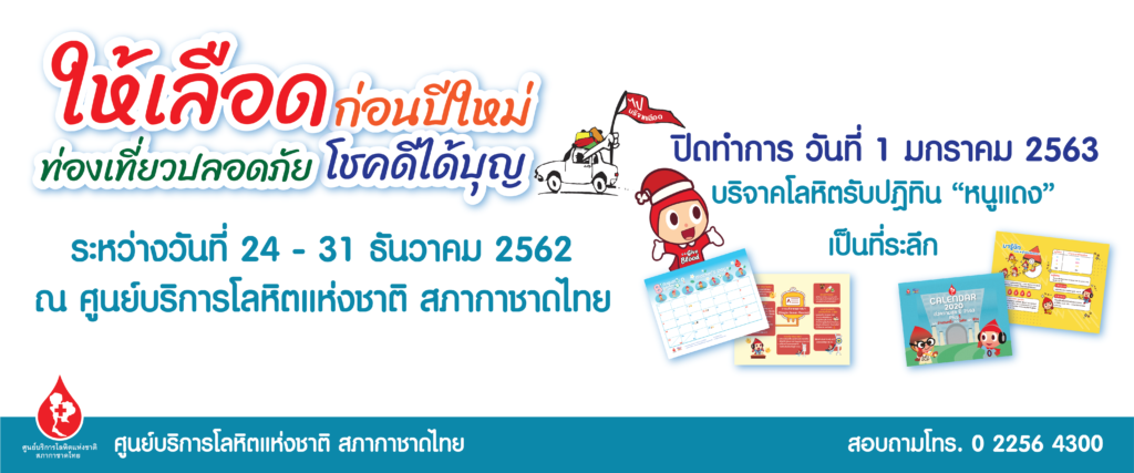 https://www.facebook.com/RMUTTRadio/videos/448651269422131/ RMUT TALK l “ สภากาชาดไทย เชิญชวนบริจาคเลือดช่วงเทศกาลก่อนปีใหม่ 2563 ” . นางสินีนาฎ อุทา ผู้ช่วยผู้อำนวยการศูนย์บริการโลหิตแห่งชาติ สภากาชาดไทย . เนื่องในเทศกาลปีใหม่ 2563 ที่กำลังจะมาถึงนี้ ศูนย์บริการโลหิตแห่งชาติ สภากาชาดไทย ขอเชิญประชาชนร่วมทำบุญบริจาคโลหิตก่อนเดินทางท่องเที่ยว ในโครงการ “ให้เลือดก่อนปีใหม่ ท่องเที่ยวปลอดภัย โชคดีได้บุญ” ระหว่างวันที่ 24-31 ธ.ค. 2562 ณ ศูนย์บริการโลหิตแห่งชาติ ถนนอังรีดูนังต์ ผู้บริจาคโลหิตจะได้รับ “ปฏิทินหนูแดง” เป็นที่ระลึก และในช่วงเทศกาลปีใหม่ จะปิดทำการ 1 วัน เท่านั้น ...
